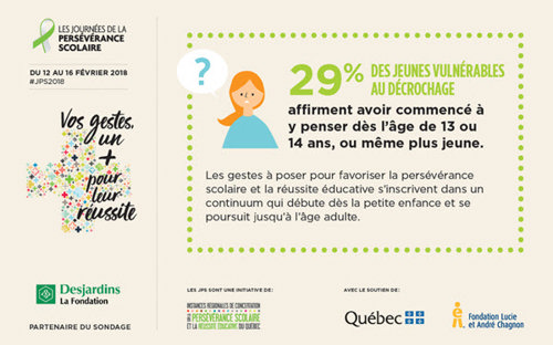 Du 12 au 16 février 2018 se tiendront les Journées de la persévérance scolaire 2018. Ces journées visent à rappeler aux élèves, aux parents, au personnel du réseau scolaire, aux employeurs et à l’ensemble des acteurs nationaux et régionaux qu’ils sont tous indispensables et qu’ils ont un rôle à jouer pour favoriser la persévérance scolaire des jeunes.