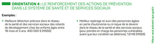 - Le renforcement des actions de prévention dans le système de santé et de services sociaux