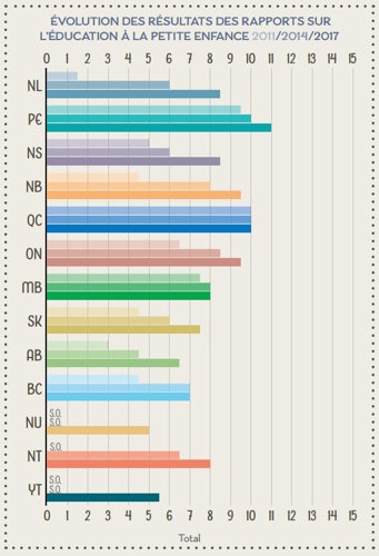 Publiée aux 3 ans, l’étude en est à sa 3e édition. Intitulé The Early Childhood Education Report 2017, ce rapport évalue les structures de gouvernance, les niveaux de financement, l’accessibilité et la qualité des services à la petite enfance au Canada, selon une échelle de 15 points. Pour la première fois, le Québec est détrôné de sa première position, au profit de l’Île-du-Prince-Édouard qui a obtenu un pointage de 11 sur 15. Le Québec maintient un pointage de 10. Le pointage le plus bas, avec 5 points, a été obtenu par le Nunavut. La moyenne nationale est de 8.