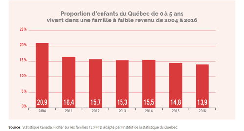 On apprenait dans le Portrait 2019 des tout-petits au Québec que 13,9 % des enfants québécois de 0 à 5 ans vivaient dans une famille à faible revenu en 2016. Cela représente environ 75 000 tout-petits.