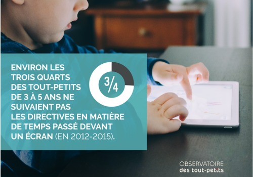 Les enfants sont initiés de plus en plus tôt aux différents écrans (télévision, téléphone intelligent, tablette électronique, ordinateur) et le temps qu’ils y consacrent est en constante augmentation. En 2012-2015, environ trois enfants sur quatre ne respectaient pas les directives en matière de temps passé devant un écran.