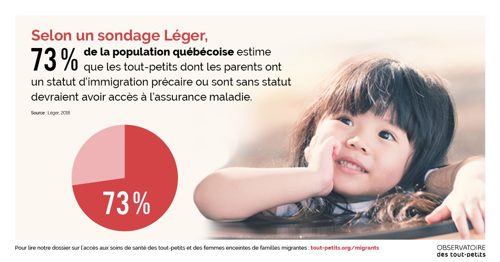 Outre l’intention d’élargir la couverture médicale aux enfants nés au Québec de parents ayant un statut d’immigration précaire annoncée hier par le gouvernement, des interventions préventives visant d’autres déterminants de la santé peuvent aussi avoir une influence positive sur la vie de ces enfants. Par exemple, faciliter l’intégration socioprofessionnelle et sociale de tous les immigrants, favoriser l’intégration des enfants dans les services de garde éducatifs et réduire l’insécurité alimentaire constituent des pistes de solutions.