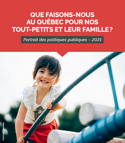 L’équipe de l’Observatoire a été particulièrement fière de dévoiler en mai 2021 le tout premier Portrait des politiques publiques, intitulé Que faisons-nous au Québec pour nos tout-petits et leur famille?, un outil de référence précieux à conserver à portée de main! Fruit de deux années de travail et d'une collaboration avec une soixantaine d'experts en petite enfance, il présente une recension des principales politiques publiques municipales, provinciales et fédérales qui peuvent contribuer à améliorer les conditions de vie et le développement des tout-petits. On y trouve également des informations clés sur l’efficacité de ces politiques et des exemples d’initiatives d’ici et d’ailleurs dont nous pourrions nous inspirer pour les améliorer. Une version Web de cette publication vous permettra de consulter facilement les sections qui vous intéressent particulièrement.