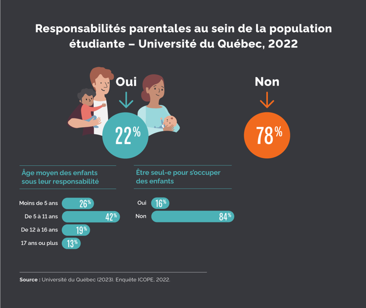 Au Québec, un nombre important de parents ont leurs enfants pendant leurs études ou retournent étudier en ayant des enfants. Par exemple, en 2022, 22 % des personnes étudiantes nouvellement inscrites dans un établissement du réseau de l’Université du Québec étaient parents et environ le quart (26 %) de ces étudiants avait un enfant de moins de 5 ans1.