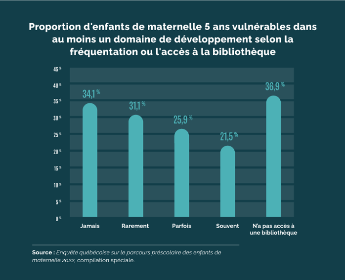 Les enfants d’âge préscolaire qui ne fréquentent pas une bibliothèque publique sont d’ailleurs plus nombreux à être vulnérables dans au moins un domaine de leur développement à la maternelle. Selon l’Enquête québécoise sur le parcours préscolaire des enfants de maternelle 2022, 34,1 % des enfants qui ne fréquentent jamais la bibliothèque avec leurs parents sont vulnérables dans au moins un domaine de développement, contre 21,5 % chez les enfants qui fréquentent souvent la bibliothèque. Chez les enfants qui n’ont pas accès à une bibliothèque, la proportion d’enfants vulnérables est encore plus élevée, soit 36,9 %.