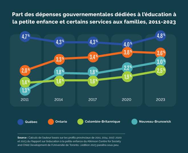 Au cours de la décennie 2010, les autres provinces canadiennes ont emboîté le pas et accéléré significativement le rythme de leurs investissements. En 2011, les dépenses publiques pour l’éducation préscolaire, les services de garde éducatifs et le soutien aux familles représentaient environ 2 % des dépenses gouvernementales en Ontario. En 2023, cette part était passée à 3,6 %. La part des dépenses gouvernementales dédiées à l’éducation à la petite enfance a également connu une importante augmentation en Colombie-Britannique et au Nouveau-Brunswick, où elle a pratiquement doublé.