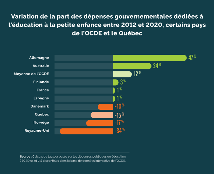 En moyenne, la part des dépenses gouvernementales dédiées à l'éducation à la petite enfance a augmenté de 12 % entre 2012 et 2020 au sein des pays de l’OCDE. Certains pays ont connu une augmentation particulièrement forte. C’est notamment le cas de l’Australie et de l’Allemagne, où la part des dépenses a bondi respectivement de 24 % et de 47 %. Au Québec, cette part diminuait de 15 % durant la même période.