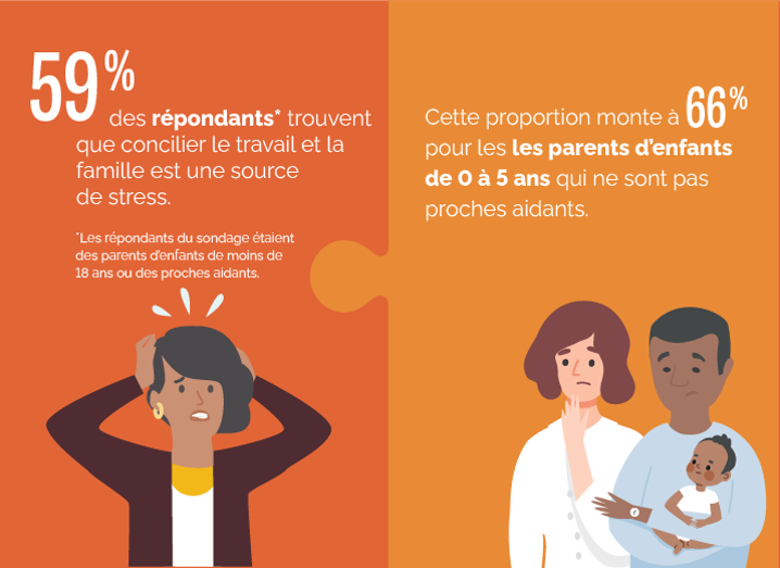 Malgré la présence de mesures de soutien aux familles au Québec, la conciliation famille-travail demeure une source de stress importante pour une majorité (66%) de parents de tout-petits.