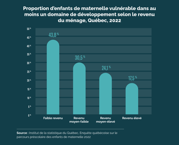Cette situation est préoccupante, d’autant plus que l’Enquête québécoise sur le parcours préscolaire des enfants de maternelle (EQPPEM 2022) établit un lien entre le revenu du ménage et le développement des enfants. Selon l’EQPPEM 2022, les enfants qui vivent dans un ménage à faible revenu sont plus susceptibles d’être considérés comme étant vulnérables dans au moins un domaine de développement2. En 2022, la proportion d’enfants de maternelle vulnérables dans au moins un domaine de développement était de 43,8 % chez les enfants vivant dans un ménage à faible revenu, contre 17,5 % chez les enfants vivant dans un ménage à revenu élevé. Cette proportion est d’ailleurs en hausse de 2,4 points de pourcentage chez les ménages à faible revenu (41,4% en 2017), alors qu’elle est demeurée stable au sein des ménages à revenu élevé (17,5% en 2017).