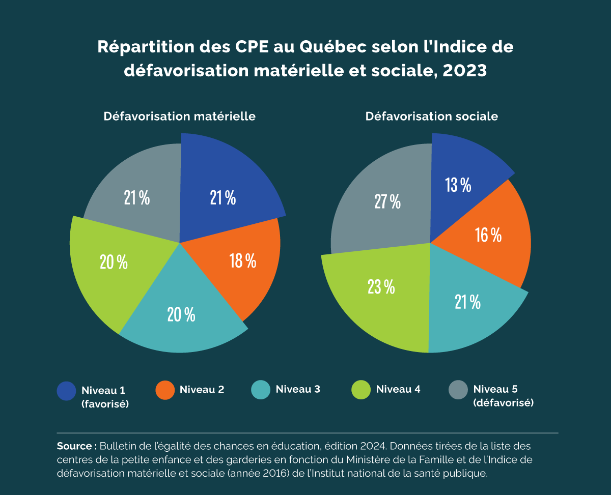 La situation diffère toutefois lorsqu’on s’intéresse à la défavorisation sociale. Le nombre de CPE est plus important dans les milieux plus défavorisés sur le plan social, avantageant ainsi les familles dont les réseaux sociaux sont les plus fragiles, comme les familles monoparentales.