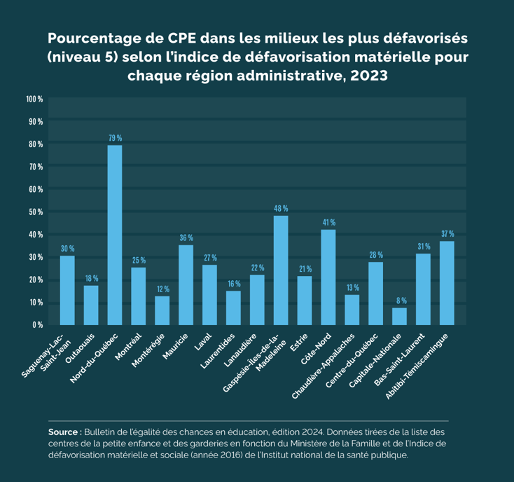 Pour parvenir à ce constat, l’équipe du Bulletin a calculé le pourcentage de CPE situés dans les milieux les plus défavorisés (niveau 5) pour chacune des régions du Québec. Cette analyse révèle que ce sont les régions du Nord-du-Québec et de la Gaspésie qui ont les plus hauts pourcentages de CPE dans les milieux où la défavorisation matérielle atteint le niveau 5.