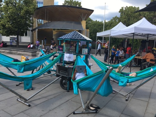 À Stockholm, la bibliothèque mobile prend plusieurs formes, grâce a un financement gouvernemental. Par exemple, le Bibliambule, conçu en France, est un triporteur autour duquel se déploient sept hamacs.