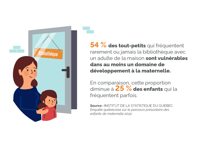 Les bibliothèques publiques ont une mission d’éveil à la lecture et à l’écriture chez les tout-petits. Elles visent de plus à soutenir les parents et les adultes significatifs dans la vie des enfants dans leurs interactions autour du livre et de la lecture, à développer leur sentiment de compétence. Elles offrent en ce sens diverses activités, telles que des heures du conte, des spectacles de marionnettes ou de théâtre, des séances de bricolage ou des ateliers de cuisine. Certaines bibliothèques proposent aussi un club de lecture pour les 0-5 ans.