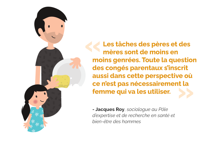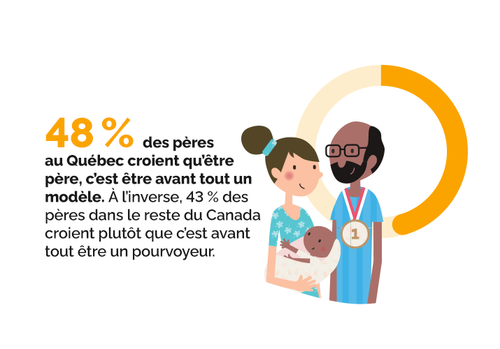 Selon certains sondages, cette évolution se ferait dans une société plus progressiste et égalitaire que les autres sociétés canadiennes. « Les pères québécois ont un modèle un peu moins traditionnel et un peu plus progressiste qu’ailleurs au Canada », confirme Jacques Roy.