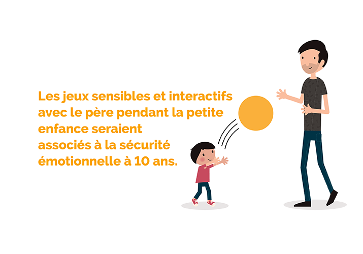 Une étude britannique révèle que l’engagement du père lorsque l’enfant a 9 mois est associé à un meilleur comportement socioémotionnel à 3 ans. Étant donné que le développement à 3 ans prédit bien celui observé à 5 et 7 ans, les chercheurs croient que même un effet léger en bas âge pourrait placer l’enfant sur une trajectoire positive de développement émotionnel et social. Cela confirme les résultats d’autres études qui montrent que les jeux sensibles et interactifs avec le père pendant la petite enfance sont associés à la sécurité émotionnelle à 10 ans. De plus, selon une méta-analyse, la quantité d’activités positives influence la capacité d’autorégulation et diminue les problèmes d’anxiété et de dépression.