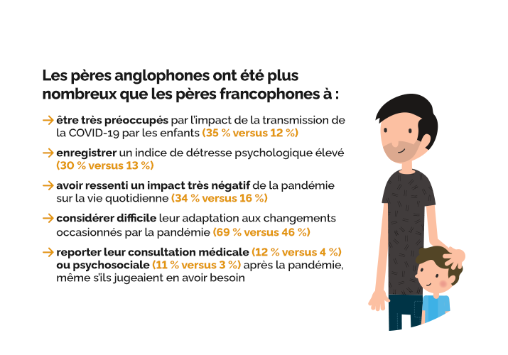 L’étude sociologique a analysé les données recueillies dans le cadre de trois sondages complémentaires, dont un sondage réalisé en 2021 par SOM. Ce dernier portait sur les hommes et la COVID-19 avec un échantillon de 2 740 hommes québécois, dont 392 hommes d’expression anglaise et 92 pères d’expression anglaise.