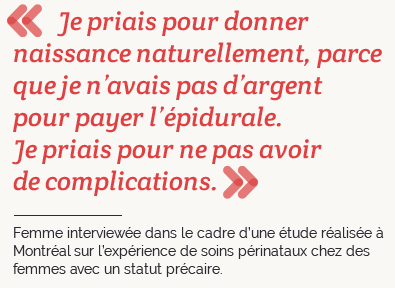 † Ces tarifs proviennent des informations recueillies par les intervenants de Médecins du Monde et du témoignage des mères interrogées dans le cadre de l’enquête Migrants sans assurance médicale à Montréal (MSAM).