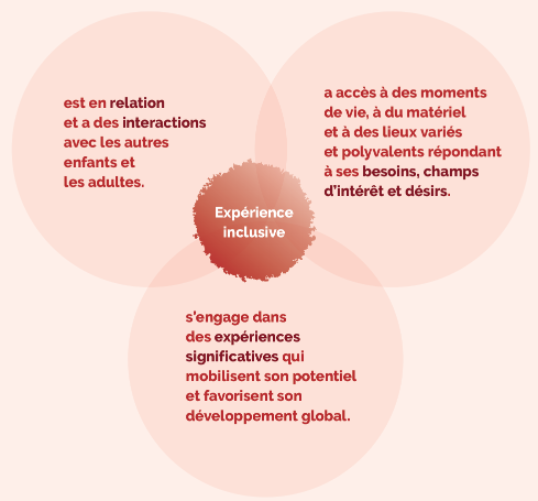 La véritable inclusion est plus que la simple présence de l’enfant dans un milieu. Elle implique la participation active et réelle de chaque enfant à la vie quotidienne, en compagnie des autres enfants. La façon dont cela se produit est différente pour chaque enfant selon ses capacités et ses besoins.