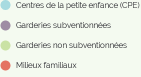 La fréquentation des services de garde éducatifs est moindre dans certaines régions du Québec. C’est le cas de Lanaudière, du Centre-du-Québec, de la Côte-Nord, du Bas-Saint-Laurent et de l’Abitibi-Témiscamingue. De plus, la répartition des places dans les différents types de services de garde éducatifs à la petite enfance varie d’une région à l’autre.