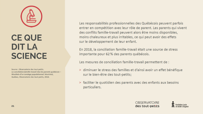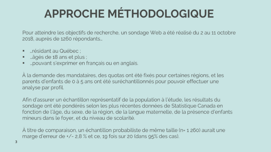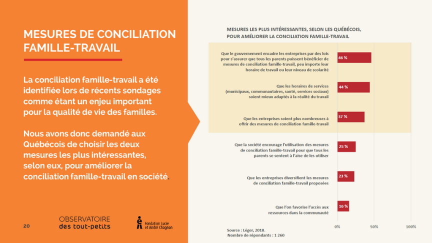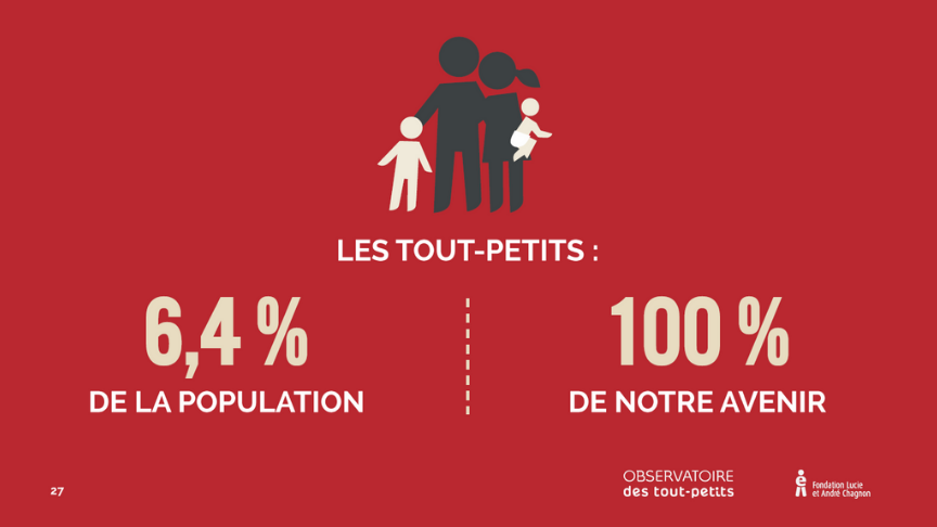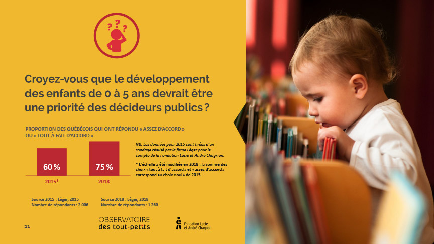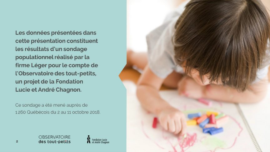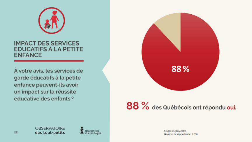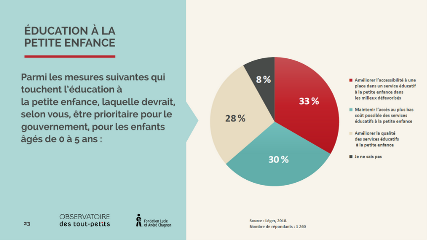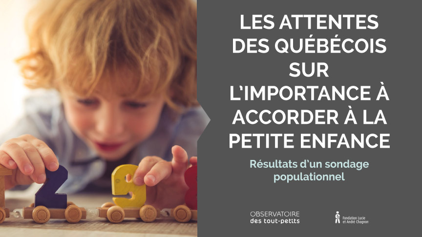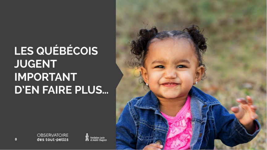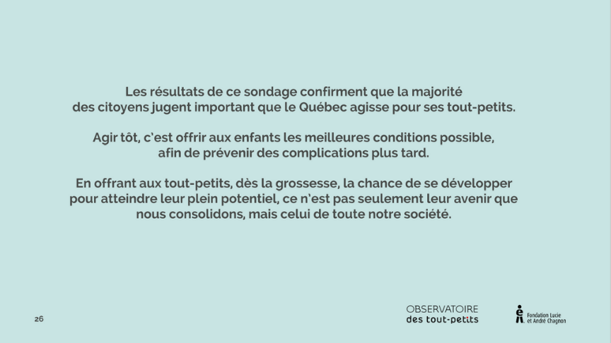 « Ce que notre sondage révèle, c’est que la petite enfance est une priorité grandissante dans le coeur des Québécois. On espère que ce sondage suscitera des réflexions auprès des acteurs de tous les secteurs de la société qui peuvent faire une différence pour le développement et le bien-être des tout-petits. »Fannie Dagenais
