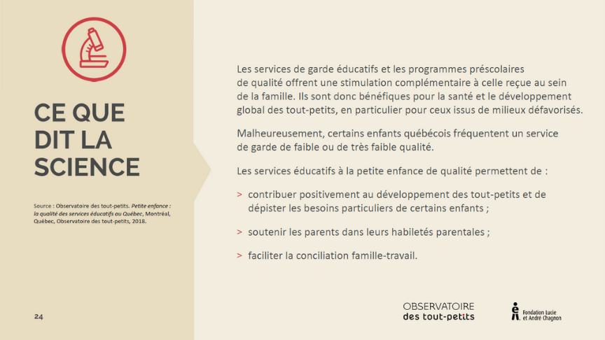 « Tous les enfants devraient avoir droit à des services éducatifs de haute qualité. C'est le consensus du Sommet sur l’éducation à la petite enfance tenu l'an dernier et c’est un souhait que semblent partager les Québécois, selon le dernier sondage rendu public par l’Observatoire des tout-petits. 88 % des répondants sont d’avis que les services de garde éducatifs à la petite enfance peuvent avoir un impact sur la réussite éducative des enfants. »Lucie Champagne